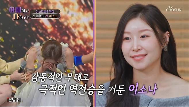 이날 이소나는 '미스트롯4' 진으로 선정됐던 순간을 떠올리며 "심장이 밖으로 나오는 줄 알았다"며 "결과를 듣고 너무 놀라 주저앉으면서 카메라 화면 밖으로 사라졌었다"고 고백했다.