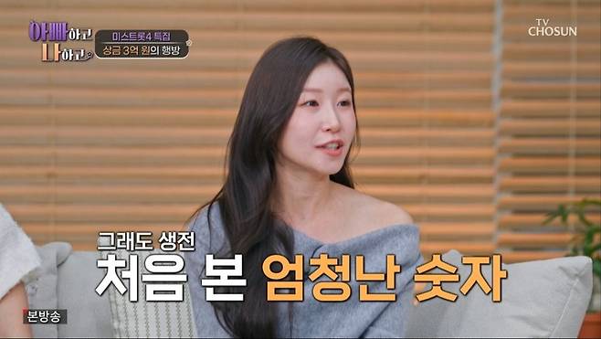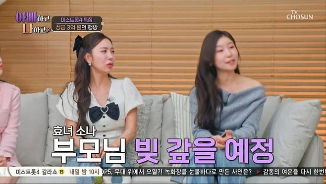 이소나는 상금 사용 계획도 공개했다. 그는 "부모님 빚을 좀 갚아 드릴 생각이다. 얼마 전 아버지 차가 고장 났는데, 이걸 바꿔드릴지 더 큰 걸 해드릴지 행복한 고민을 하고 있다"며 "남편은 명품 브랜드는 아니지만 어릴 때부터 갖고 싶어 하던 시계가 있어 그걸 사달라고 했다"고 말했다.
