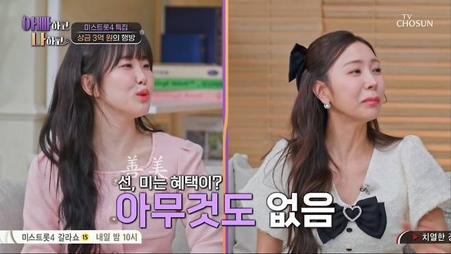 반면 선 허찬미와 미 홍성윤은 별도의 혜택을 받지 못했다고 밝혀 눈길을 끌었다. 두 사람은 "신발이나 화장품 같은 것도 하나도 못 받았다"고 털어놨고, 이를 들은 전현무는 "제가 도시락이라도 챙겨드리겠다"고 농담을 던지며 분위기를 유쾌하게 마무리했다.