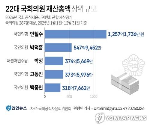 (서울=연합뉴스) 원형민 기자 = 26일 국회 공직자윤리위원회가 공개한 '2026년 국회의원 정기재산변동사항 신고 내역'에 따르면 지난해 말 기준으로 가장 재산이 많은 의원은 국민의힘 안철수 의원으로 1천257억1천736만원을 신고했다.
