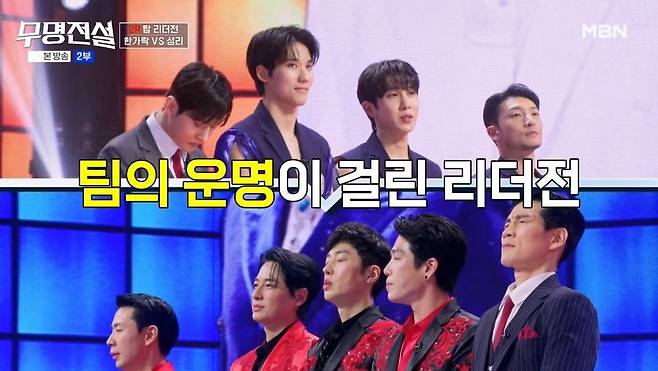 25일 밤 MBN '무명전설 - 트롯 사내들의 서열전쟁' 5회에서는 '팀 데스매치' 1라운드 팀 대항전의 남은 승부에 이어, 팀의 생존을 리더가 책임지는 2라운드 '탑 리더전'이 펼쳐졌다.