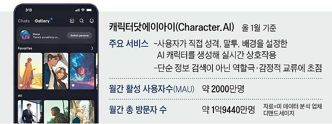 작년 캐릭터닷AI 매출액 전망치는 5000만달러(약 750억원), 기업 가치는 10억달러(약 1조5000억원)다. 캐릭터닷AI는 캐릭터를 활용한 만화 제작, 좋아하는 캐릭터가 진행하는 인터랙티브 팟캐스트, 캐릭터의 기분과 포즈를 실시간으로 바꿔 이미지를 만드는 ‘이미지 스튜디오’ 등의 서비스를 추가로 내놓을 예정이다.