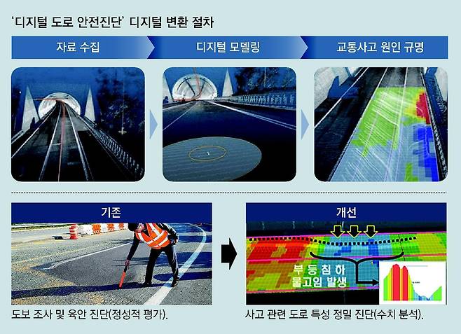 한국도로공사는 이러한 한계를 극복하기 위해 레이저 반사를 이용해 형상을 분석하는 라이다(LiDAR) 센서와 디지털 변환(DX)을 결합한 ‘디지털 도로 안전진단’ 기술을 도입했다. 이 기술은 LiDAR 센서를 탑재한 차량이 도로의 형상을 정밀하게 스캔하고 수집한 데이터로 도로의 실제 상태를 정교하게 재현한 디지털 모델을 생성한다.