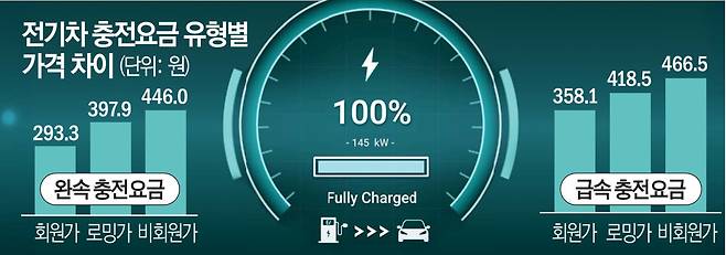 전기차 충전요금은 가입 유형과 사업자에 따라 달라진다. 한국소비자원이 국내 주요 20개 사업자를 조사한 결과에 따르면 완속 충전 평균 요금은 약 293원/kWh 수준으로 나타났다. 로밍요금은 약 398원/kWh, 비회원 요금은 446원/kWh대로 가장 비쌌다.