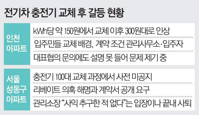 서울 성동구의 한 대형 아파트도 최근 전기차 충전기 100여 개를 교체하는 과정에서 사전 공지가 제대로 이뤄지지 않았다는 논란이 불거졌다. 입주민들은 리베이트 의혹 해명과 계약서 공개를 요구하며 반발하고 있다. 관리사무소 측은 사익 추구 의혹을 부인했지만 논란이 커지면서 해당 관리소장은 결국 사퇴한 것으로 알려졌다.
