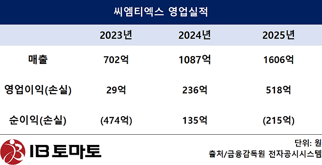 [IB토마토 윤상록 기자] 반도체 소재·부품 전문 기업 씨엠티엑스(388210)가 국내 반도체 호황 속 외형 성장에 박차를 가하고 있다. 다만 회사는 지난해 전환상환우선주(RCPS) 평가손실이 발생하면서 순손실을 기록했다. 회사 측은 지난해 RCPS가 보통주로 전환되며 재무구조가 개선되는 긍정적 효과가 있었다며, 올해는 순이익을 기록할 것으로 보고 있다고 밝혔다.