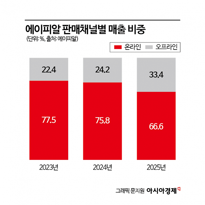 26일 에이피알 사업보고서에 따르면 회사의 판매 채널 구조는 기존 온라인 중심에서 점차 오프라인 비중이 확대되는 방향으로 변화하고 있는 것으로 확인됐다. 에이피알의 온라인과 오프라인 비중은 2023년 온라인 77.5%, 오프라인 22.4%에서 2024년 온라인 75.8%, 오프라인 24.2%, 2025년엔 온라인 66.6%, 오프라인 33.4%를 기록했다. 자사몰과 글로벌 플랫폼을 기반으로 성장해온 에이피알이 유통 채널을 다변화하며 본격적인 외형 확장 단계에 진입했다는 분석이 나온다.