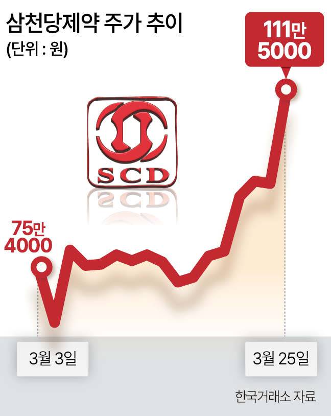 삼천당제약 주가가 100만원을 돌파하는 '황제주(주당 100만원 이상 주식)'에 등극했다.