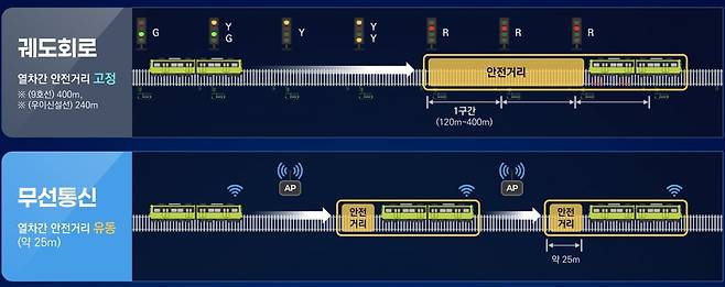 새로 도입하는 무선통신 방식은 열차와 관제실이 무선으로 대화하며 실시간으로 위치를 정밀하게 파악한다. 내비게이션처럼 열차 위치를 따라가며 제어할 수 있어 안전거리를 25m까지 획기적으로 줄일 수 있다. 이렇게 되면 동일한 시간에 더 많은 열차를 운행할 수 있어 약 20%의 수송력 향상 효과를 거둘 수 있다. 예를 들어 2분30초인 배차 간격을 2분까지 줄이면 5번 운행할 때 열차 한 편성을 더 투입하는 것과 같은 효과가 나타나 혼잡도가 낮아진다.