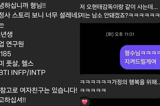 장성규가 공개한 사진에는 '안녕하십니까 형님!! 결정사 스토리 보니 너무 설레네요. 저는 98년생 직업 연구원 키 185cm 취미 풋살 헬스 MBTI INFP/INTP 아 참고로 여자친구는 있습니다. 수고하십쇼!'라는 내용이 담겼다. 또한 어떤 감독과 같이 산다는 여성도 장성규에게 남소(남자 소개)를 부탁해 장성규가 이를 비밀로 하기로 한 내용도 있었다.