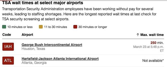 무급 근무 여파로 교통안전청(TSA) 직원 약 500명이 사직하고 3100명 이상이 결근하면서 이른바 '공항 대란'이 벌어졌다.