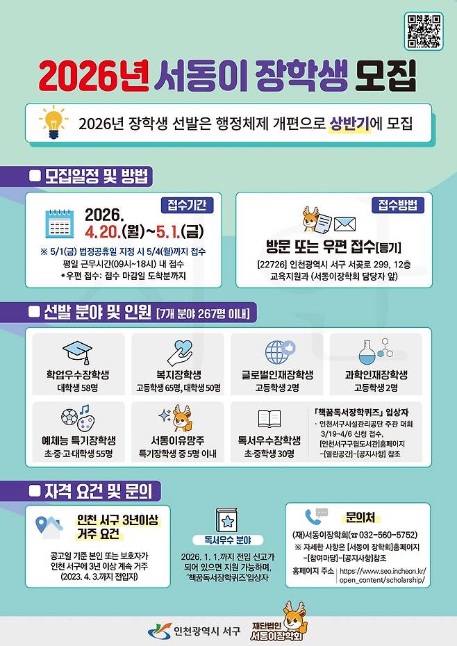 인천시 서구는 지역 인재 양성을 위한 2026년도 서동이 장학생을 모집한다.
