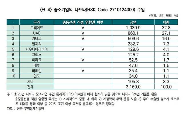 중소벤처기업연구원이 26일 발표한 '중동전쟁이 중소기업에 미치는 영향과 시사점' 보고서에 따르면 2024년 기준 중소기업의 나프타 수입 가운데 82.8%가 쿠웨이트·아랍에미리트(UAE)·카타르 등 중동 지역에 집중돼 있다.