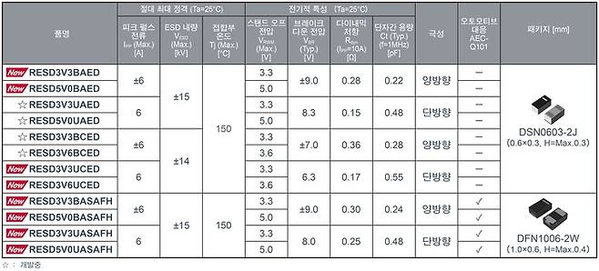 해당 제품은 AI 서버, 5G·6G 통신 장비 등 산업기기뿐 아니라 노트북, 게임기 등 고속 데이터 통신을 사용하는 다양한 민생기기에 적용 가능하다. 또한 DFN1006-2W 패키지를 적용한 'RESDxVxBASAFH'와 'RESDxVxUASAFH'는 자동차용 신뢰성 규격인 AEC-Q101을 충족해, ADAS(첨단 운전자 지원 시스템), 자율주행용 카메라, ECU 등 차량용 애플리케이션에도 활용할 수 있다.