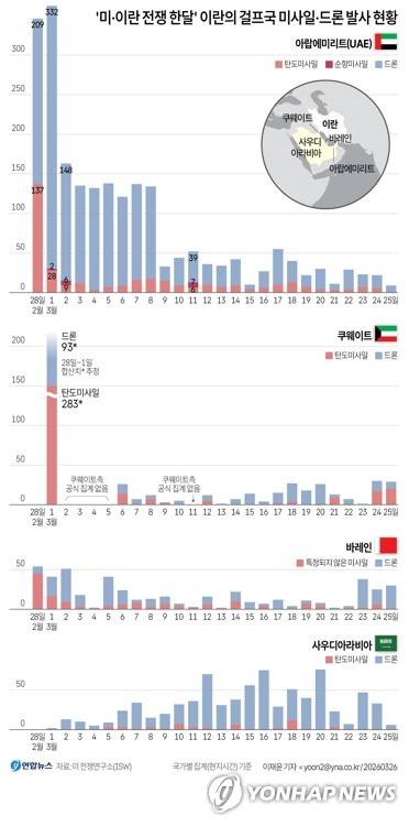 [그래픽] '미·이란 전쟁 한달' 이란의 걸프국 미사일·드론 발사 현황