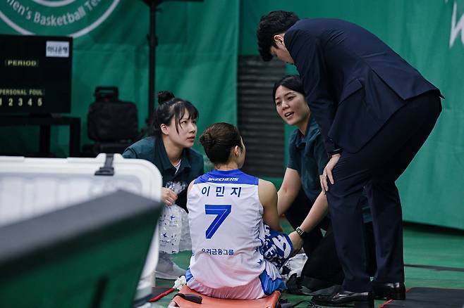 공격권이 하나은행으로 넘어갔다가 결국 경기가 중단됐다. 이민지는 오른쪽 무릎을 잡고 고통을 호소했고, 결국 일어나지 못하고 들것에 실려나가고 말았다. 이후로도 이민지는 눈물을 흘리면서 아픔을 느꼈다.