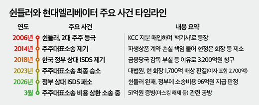 과거 현대그룹의 '백기사'로 등장했던 쉰들러는 2014년 주주대표소송을 기점으로 적대적 관계로 돌아섰습니다. 이후 유상증자 참여 거부와 지분 희석, ISDS 제기 등으로 부딪히다가, 지난 14일 국제상설중재재판소(PCA)가 한국 정부의 손을 들어주며 쉰들러가 위축됐습니다. 이로 인해 쉰들러가 정부에 물어줘야 할 소송 비용만 96억원에 달합니다.