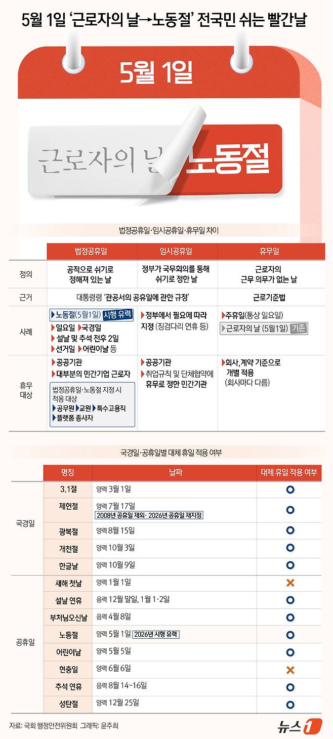 [오늘의 그래픽] 5월 1일 '근로자의 날→노동절' 전국민 쉬는 빨간날
