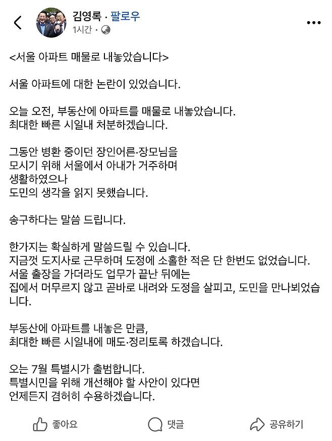 이어 26일 SNS를 통해 "병환 중이던 장인어른·장모님을 모시기 위해 서울에서 아내가 거주하며 생활하였으나 도민의 생각을 읽지 못했다"며 "부동산에 아파트를 내놓은 만큼, 최대한 빠른 시일 내에 매도·정리하겠다. 지금껏 도지사로 근무하며 도정에 소홀한 적은 단 한 번도 없었다. 서울 출장을 가더라도 업무가 끝난 뒤에는 집에서 머무르지 않고 곧바로 내려와 도정을 살피고, 도민을 만나뵀다"고 했다.
