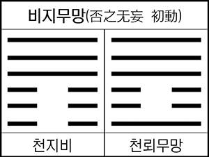 즉, 비의 때에는 막히고 통하지 않으니 동지들과 함께 참고 기다리는 것(貞)이 길하고 형통하다는 것을 가르쳐 주고 있다. 따라서 비괘의 초효에서는 무모하게 움직이면 위험하고 어려움에 봉착한다.