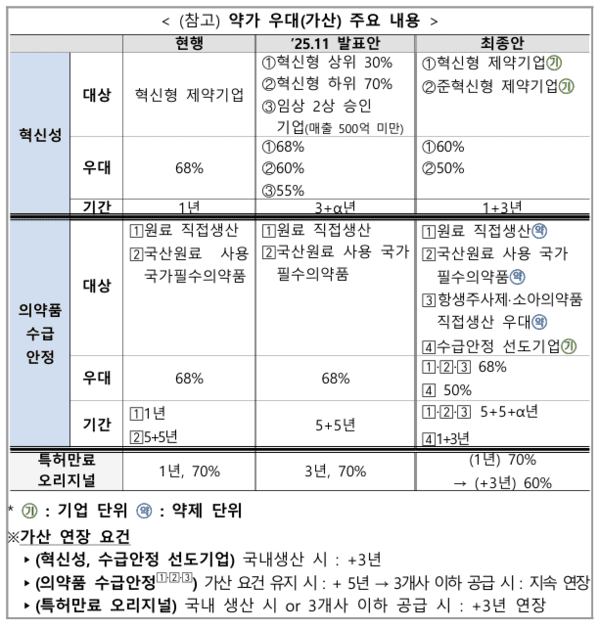 초안에서는 혁신형제약기업에만 특례를 적용한다고 발표했으나, 그동안 연구개발(R&D)을 충실히 해오면서 혁신형 신약을 개발한 역량을 키워온 기업들에게도 특례가 적용돼야 한다는 의견을 수용한 것이다.