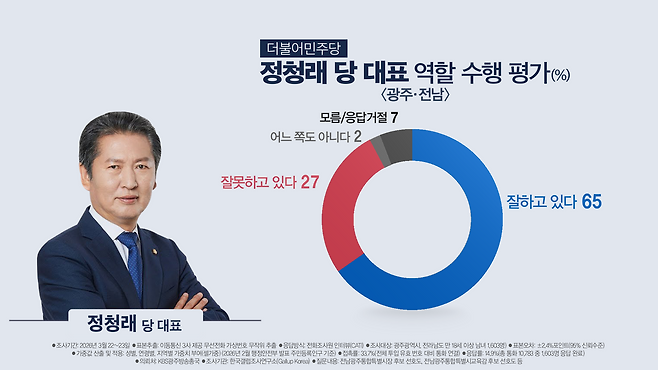 정청래 대표가 역할을 잘 하고 있는지도 물었습니다. 잘하고 있다 65%, 잘못하고 있다 27%로 나타났습니다.