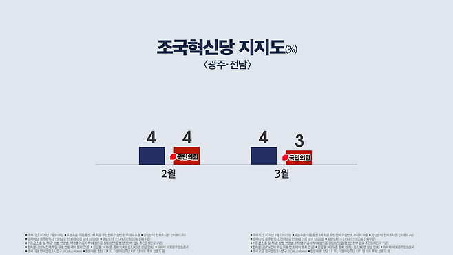 혁신당은 지난 2월 KBS 여론조사에서도 지지율이 4%였습니다. 6월 지방선거에서 민주당과의 경쟁을 예고했지만, 지지율은 여전히 국민의힘과 비슷한 수준에 머물고 있습니다.