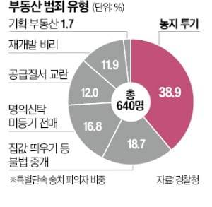 경찰청 국가수사본부는 지난해 10월 17일부터 올해 3월 15일까지 5개월간 부동산 범죄 특별단속을 해 1493명을 단속하고 640명을 송치했다고 밝혔다. 이 중 중대 범죄를 저지른 7명은 구속됐다. 유형별 송치 인원은 농지 투기 249명(38.9%), 집값 띄우기 등 불법 중개 120명(18.7%), 명의신탁 미등기 전매 107명(16.8%), 공급질서 교란 77명(12.0%) 등이다. 이번 단속은 ‘10·15 주택시장 안정화 대책’ 후속 조치로 이뤄졌다.