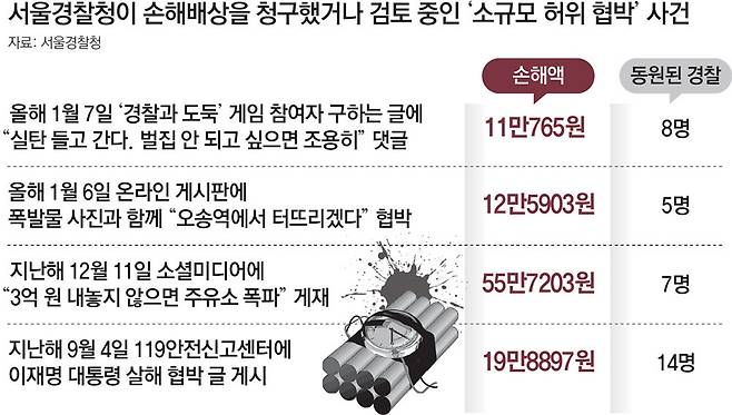 실제로 올해 심의위원회에 오른 15건 중 7건은 동원된 경찰이 15명 미만이고 이로 인한 손해액이 60만 원에 못 미치는 소규모 사건이었다. 1월 6일 한 30대 남성이 온라인 게시판에 폭발물 사진과 함께 “(충북) 청주 오송역에서 터뜨리겠다”는 취지의 글을 올렸을 당시 서울청에서 동원된 인력은 5명, 손해액은 12만5903원이었지만 경찰은 이에 대해서도 손해배상을 심의했다. 지난해 12월 11일 소셜네트워크서비스(SNS)에 ‘주유소 폭파 예고’를 올린 10대 여성에게도 출동 직원 7명의 인건비 등 55만7203원을 청구할 예정이다.
