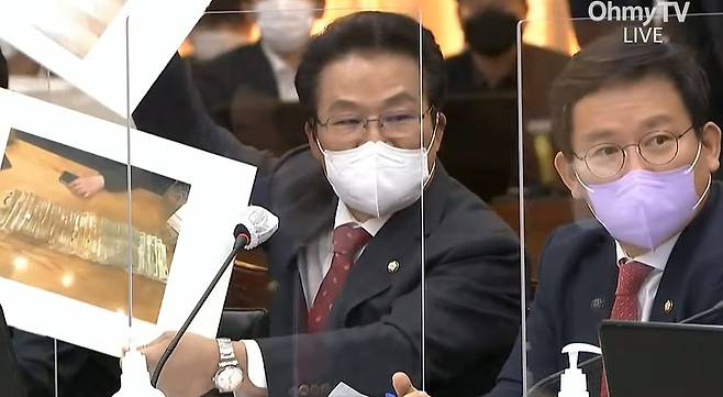 | ▲ 18일 경기도청에서 열린 국회 행정안전위원회 국정감사는 김용판 국민의힘 의원은 “수원구치소에 수감된 ‘국제마피아파’ 행동대원이자 코마트레이드 직원이었던 박아무개씨의 요청으로 변호인과 접견했다"면서 박씨에게 제보받은 내용을 공개했다. 김용판 의원은 이재명 경기도지사가 성남시장 재임 시절 전달받은 현금이라면서 1억원과 5000만원이 각각 촬영된 현금 다발 사진을 공개했다. 2021-10-18 |