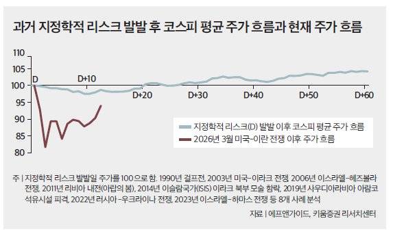 따라서 현재 금융시장 불안의 핵심인 시장금리 급등 사태는 진정될 가능성을 열어두고 가는 편이 적절하다. 또한 주식시장도 과거 수차례 지정학적 사건에 대한 학습 효과(전쟁 초기 극도의 공포와 증시 하락→외교적 봉합과 회복 경로 진입)를 체득해왔으며 이번 미국-이란 전쟁 역시 동일한 학습효과를 발휘할 것으로 판단된다(그래프 참조).