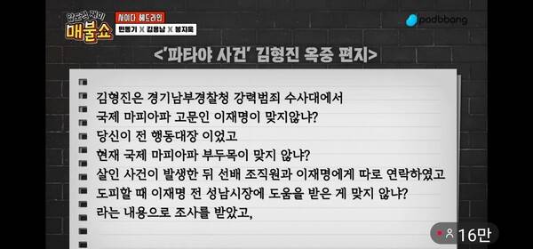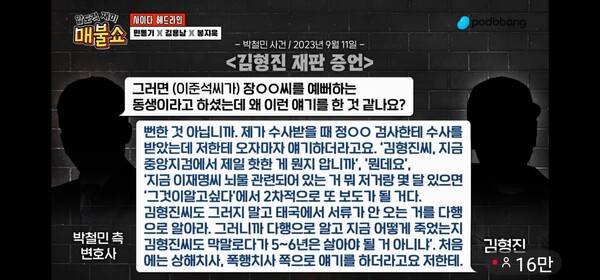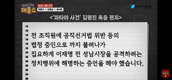 봉지욱 기자는 26일 '최욱의 매불쇼'에 다시 출연, 윤석열 정부의 검찰과 경찰이 김형진에게도 이재명의 '조폭 연루설'을 인정하는 증언을 해준다면 감형을 해주겠다며 회유에 나섰다고 추가 증거들을 제시했다. 그는 김형진이 수감 중에 부친에게 보낸 편지들을 증거로 들었다. (다만 편지 겉봉을 뜯어버린 상태라 수신 날짜를 밝히지 못한다고 설명했다)