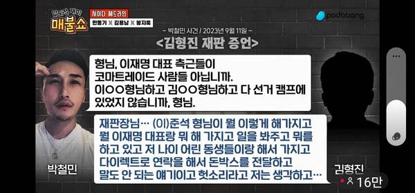 봉 기자는 박철민이 이준석 코마트레이드 대표에게 '이재명을 잡기' 위해 힘을 합치자고 설득하는 과정에 국민의힘 관계자의 도움을 받고 있다며 '이낙연 캠프', 심지어 윤석열 검찰총장의 이름도 들먹이기도 했다고 전했다. 그러면서 파타야 살인 사건을 저질러 징역 17년형을 선고받고 순천교도소에서 복역 중이던 김형진에게도 접근했다가 뜻대로 되지 않자 김형진을 고발했다는 내용도 보탰다.