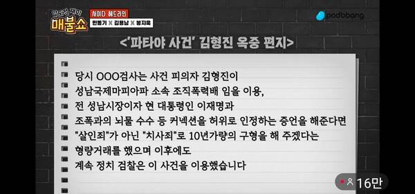 놀랍게도 김형진은 검사의 이름까지 적시하며 "이재명과 조폭의 뇌물(20억 원) 수수 등 커넥션을 허위로 인정하는 증언을 해준다면 '살인죄'가 아닌 '치사죄'로 10년가량의 구형을 해주겠다는 형량거래를 했으며 이후에도 계속 정치 검찰은 이 사건을 이용했다"고 적었다. 봉 기자는 검찰의 회유한 시점을 대략 2022년 5월 제20대 대통령 선거 전으로 봤다.