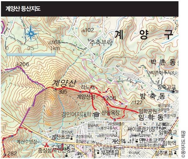 인천지하철 1호선 계산역 5·6번 출구로 나와 건물을 끼고 돌면 북쪽으로 시원하게 뻗은 대로가 눈앞에 펼쳐진다. 인천시내를 관통하는 주부토로는 계양산을 만나며 끝이 난다. 도로 왼편에는 오랫동안 자리를 지켜온 식당들이 줄지어 있고, 오른편 체육공원과 계산고등학교에서는 왁자지껄한 목소리가 울려 퍼진다. 그 사이로 캐주얼한 옷차림의 등산객들이 비탈길을 따라 산자락을 향해 걷는다. 이곳은 인천광역시 계양구. 지대가 낮아 이렇다 할 명산이 없는 인천 도심에서 산과 녹음의 혜택을 톡톡히 누리는 곳이다.