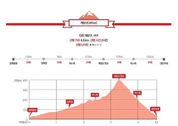 해발 395m라는 높이만 보고 계양산을 얕잡아 보는 서울 토박이에게 '계양산 정상에 에펠탑이 있다'고 하면 코웃음을 친다. 그러나 정말로 있다. 흔히 '계펠탑(계양산+에펠탑)'으로 불리는 송신탑은 계양산의 트레이드마크. 사실 '계펠탑'은 평범한 송신탑에 지나지 않지만, 계양산은 한 번쯤 가볼 만한 산이다. 인천 내륙에서 가장 높은 산이라 조망이 빼어나고, 지하철역과 가까워 대중교통으로 접근하기 수월하며, 산세가 험하지 않아 수도권 반나절 산행으로도 제격이기 때문이다. 인천의 진산이자 시민의 뒷동산임을 증명하듯 평일에도 사람들의 발걸음이 끊이지 않는다.