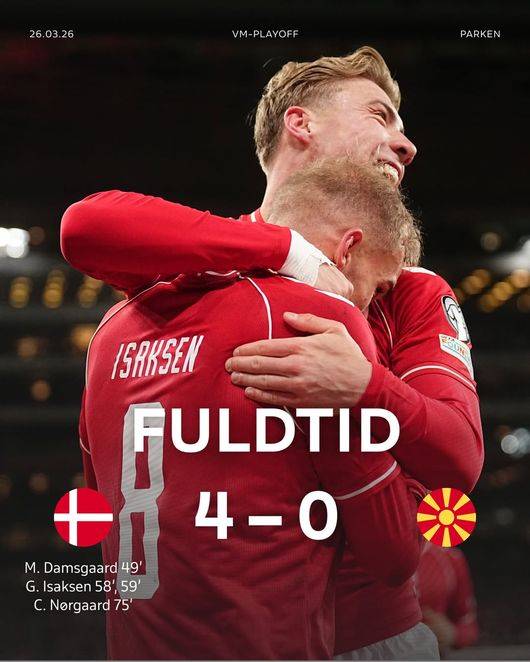 덴마크는 27일(이하 한국시간) 덴마크 코펜하겐의 파르켄에서 열린 대회 유럽 예선 플레이오프(PO) 패스D 준결승에서 북마케도니아를 4-0으로 완파하고 결승에 올랐다.
