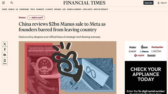 | ▲ 중국 정부가 마누스의 창업자들을 출국 금지하고, 메타의 마누스 인수 과정에 대한 조사에 들어갔다고 보도한 <파이낸셜 타임스> 기사. |