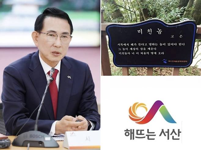 이완섭 충남 서산시장이 서산시 슬로건인 '해뜨는 서산'에 대한 일부 비판에 '미친놈'이라는 고은 시인의 시를 인용하며 맞대응했다.