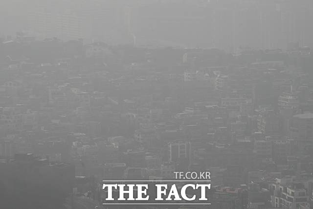 [더팩트 | 김성렬 기자] 초미세먼지 주의보가 발령된 27일 오전 서울 중구 남산공원에서 바라본 도심지역이 뿌옇게 보이고 있다.