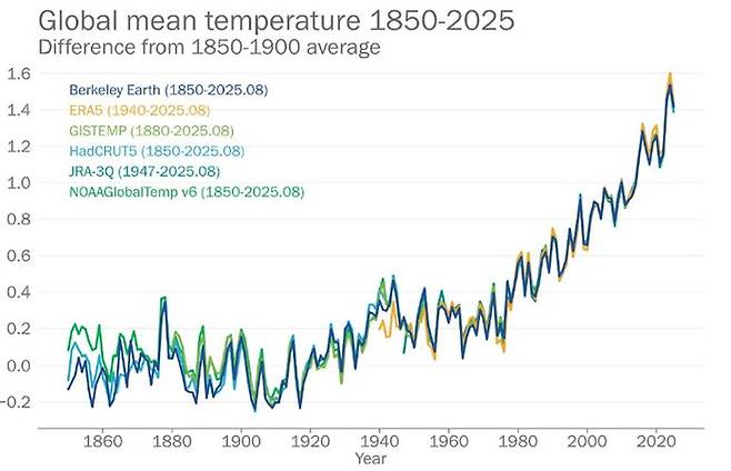 기후변화로 지구 온도는 계속 오르고 있습니다. 2025년에도 마찬가지였는데요. 지난해 1월~8월 ,전 지구 평균기온은 산업화 이전 대비 1.42℃ 높았습니다. 우리가 마지노선으로 잡은 1.5℃에 근접했습니다. 심지어 2024년은 전 지구 평균기온이 산업화 이전 대비 1.55±0.13℃로 이미 1.5℃를 넘어선 해였습니다.