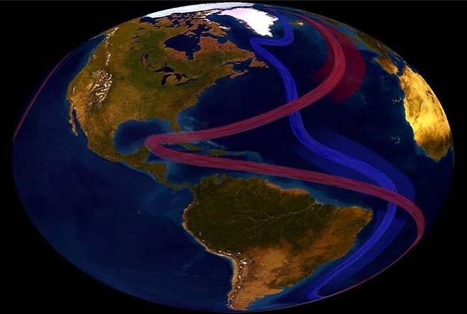 지구는 대기와 해양을 통해 열을 적절하게 분배합니다. 적도는 열이 많이 쌓이기 때문에 열은 해양과 대기를 통해 극 지역으로 이동합니다. 대기 대순환과 해양 순환이 생기는 원인이자 존재 이유죠. 북대서양 순환 역시 적도 쪽에 쌓인 열과 염분을 극 지역으로 수송하는 역할을 합니다. 따뜻한 물이 북쪽으로 이동하면 차가워져 가라앉고 다시 심층 순환을 통해 저위도로 이동하는 대규모 해수 순환입니다.