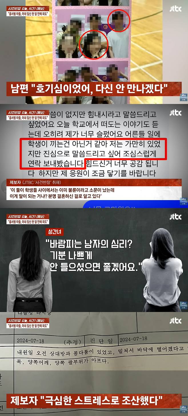 A씨는 남편에게 외도 사실을 추궁했으나, 남편은 오히려 임신 5개월이었던 A씨에게 중절을 요구하고 가출을 감행했다. 이후 A씨가 학교로 찾아가 항의하는 과정에서, 홍모씨는 A씨를 밀쳐 넘어뜨려 손목과 허리를 다치게 했다. 신체적 물리력 행사와 극심한 스트레스로 인해 A씨는 예정일보다 한 달 빠르게 아이를 조산했다고 밝혔다.