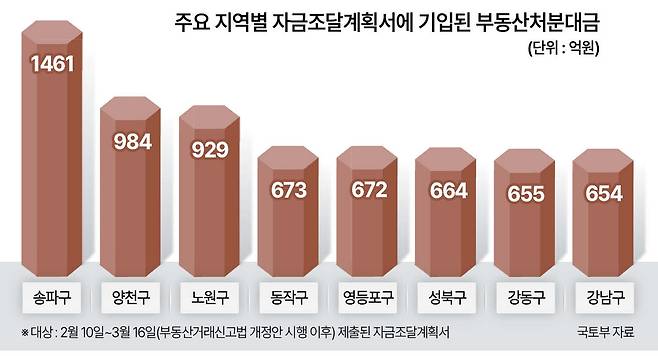 ▶한 달 간 자조서 5597건 제출…‘부동산 처분’ 전체 거래 60% 넘어=27일 헤럴드경제가 입수한 국토교통부의 ‘주택취득자금 조달 및 입주계획서(계약일 기준, 단독·다가구·연립·아파트 대상) 자료’를 분석한 결과 지난 2월 10일 이후부터 3월 15일까지 약 한 달간 서울 25개 자치구서 제출된 자금조달계획서는 총 5597건으로 집계됐다. 가장 높은 건수를 기록한 지역은 노원구(601건)였으며, 그 뒤로 은평구(416건), 강서구(397건), 성북구(373건), 송파구(361건), 양천구(320건) 등이 이어졌다.