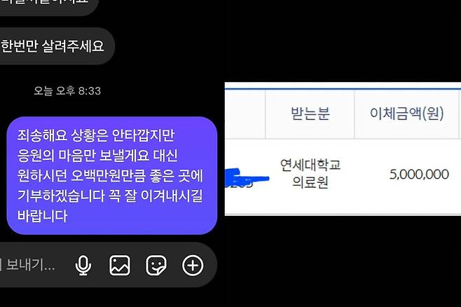 이어 장성규는"대신 원하시던 오백만원만큼 좋은 곳에 기부하겠다. 꼭 잘 이겨내시기를 바란다"고 응원의 말을 이었다. 실제 그는 연세대학교 의료원에 500만원을 기부한 사진을 공개했다.