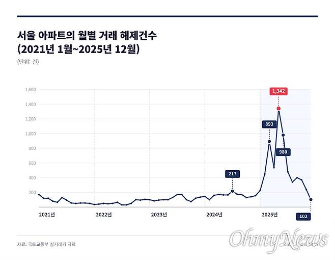 | ▲ 서울 아파트 월별 거래 해제 건수. 2025년 급증했다. |
