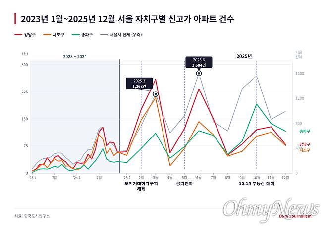 <오마이뉴스>는 한국도시연구소가 집계한 2022년 1월~2025년 12월 3년간 서울 아파트(1만6398개 단지) 월별 평균 실거래가격 자료를 활용해 월별 신고가 경신 건수를 집계해본 결과, 서울시 아파트 신고가 건수가 가장 많았던 때는 지난 2025년 6월(1604건)과 2025년 3월(1268건) 순으로 나타났다. 분석 기간 3년을 통틀어 신고가 거래 건수가 1000건이 넘었던 것은 2025년 3월이 최초였는데, 그만큼 신고가 거래가 이례적으로 많았다는 방증이다.