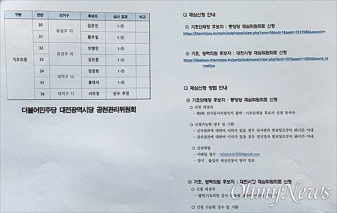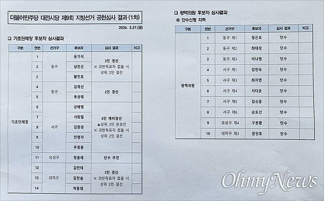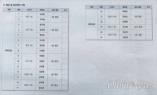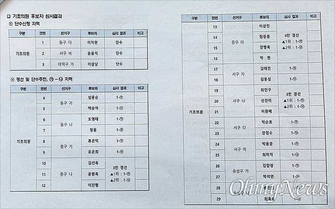 | ▲ 더불어민주당 대전시당 공천심사위원회가 공개한 1차 심사 결과. |