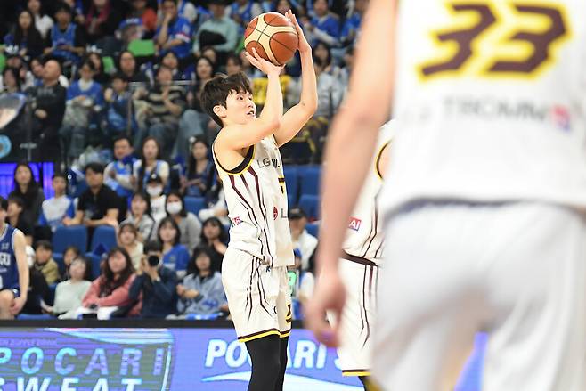 이날은 달랐다. LG는 경기 초반부터 주도권을 잡았다. 양준석(180cm, G)의 3점슛 2개로 포문을 열었고, 유기상(188cm, G)도 연속 3점슛을 터뜨렸다. 여기에 양홍석(195cm, F)이 쿼터 종료 버저와 함께 우측 코너에서 던진 3점슛이 림을 통과하며 26-15, 11점의 격차로 1쿼터를 마쳤다. LG는 1쿼터에 3점슛 5개를 모두 적중시키며 앞서갔다.