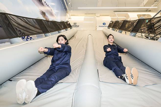파라타항공과 유한대학교가 협력해 구축한 항공훈련센터 개소식이 27일 경기도 부천시 유한대학교에서 열렸다. 이날 항공훈련센터에서 파라타항공 승무원들이 비상 상황 발생 시 슬라이드 탑승·비상 착륙·화재 진압·기내 포승줄 포박 훈련을 하고 있다. 이 항공훈련센터는 승무원의 실제 업무 환경을 반영해 비상탈출 실습실, 기내 서비스 실습실, 이미지 메이킹 실습실 등으로 구성돼 승무원들이 실제 항공기 객실 환경과 유사한 공간에서 안전 절차와 서비스 업무를 체계적으로 훈련할 수 있다.